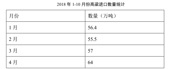 下表为 2018 年 1-10 月份中国进口高粱的数量统计, 2018 年 4 月 4 日,经国务院批准,国务院关税税则委员会决定对原产于美国的大豆、汽车、化工品等 14 类 106 项商品加征 25%的关税,从表中可以看出 5 月份进口高粱数量有所减少。 2018 年 7 月 6 日,美国对第 一轮价值 340 亿美元的中国商品正式征收 25% 的关税,从下表可看出进入 8 月份后进口高粱数量明显减少,国产高粱优势明显,价格开始上扬。此次贸易战和解后预计高粱进口量有望恢复,势必将对国产高粱价格产生冲击,为此,各高粱经营主体应适时出售手中存粮,以减轻损失。