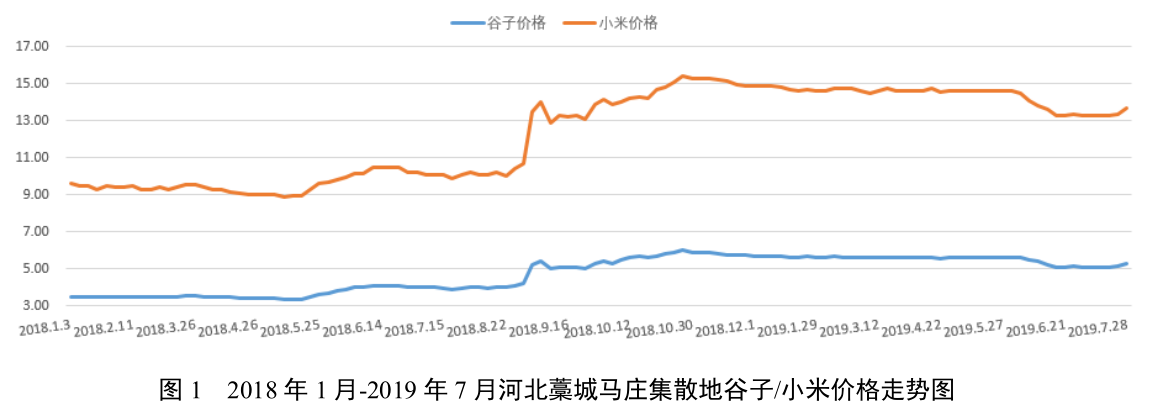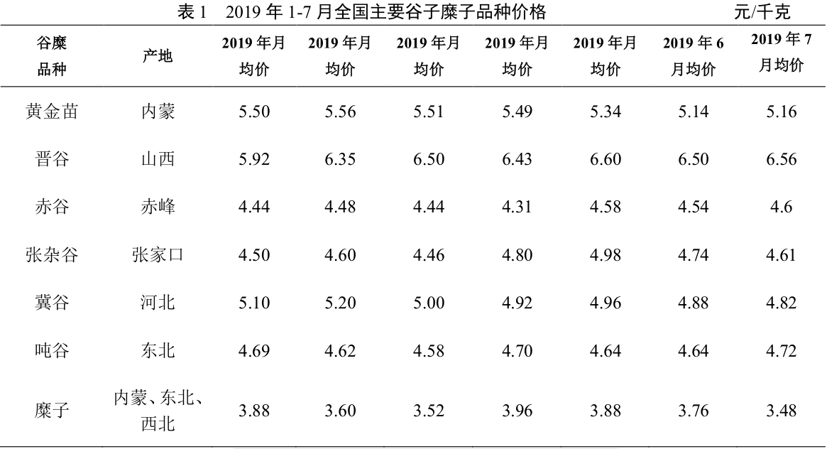 7 月份黄金苗、晋谷、赤谷、吨谷的价格小幅上涨,张杂谷、冀谷的价格小幅下滑,其中,2014-2016 年黄金苗陈谷价格为 3.30 元/千克,2017 年黄金苗陈谷价格为 4.22 元/千克,2016 年吨谷陈谷价格为 3.26 元/千克。糜子价格降幅较大,环比下降 7.45%。