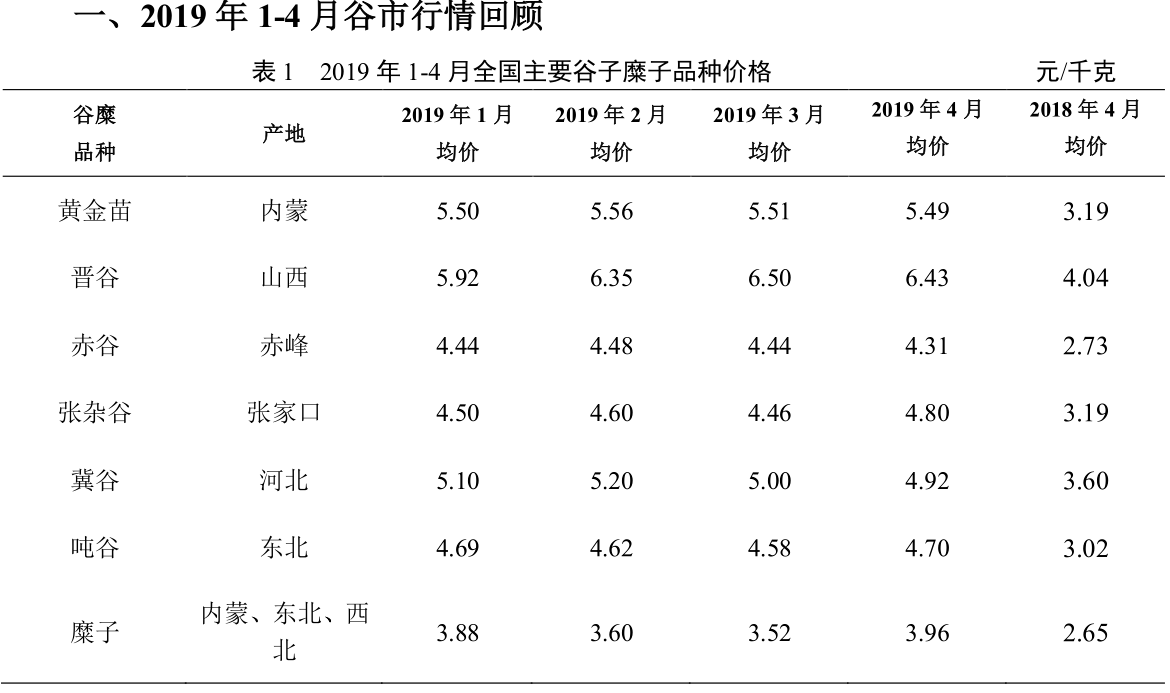 4 月份谷子价格略有下调,均价为 5.59 元/千克,小米均价为 9.00 元/千克,整体来看,1-4 月份,谷价窄幅下移,波动幅度有限。