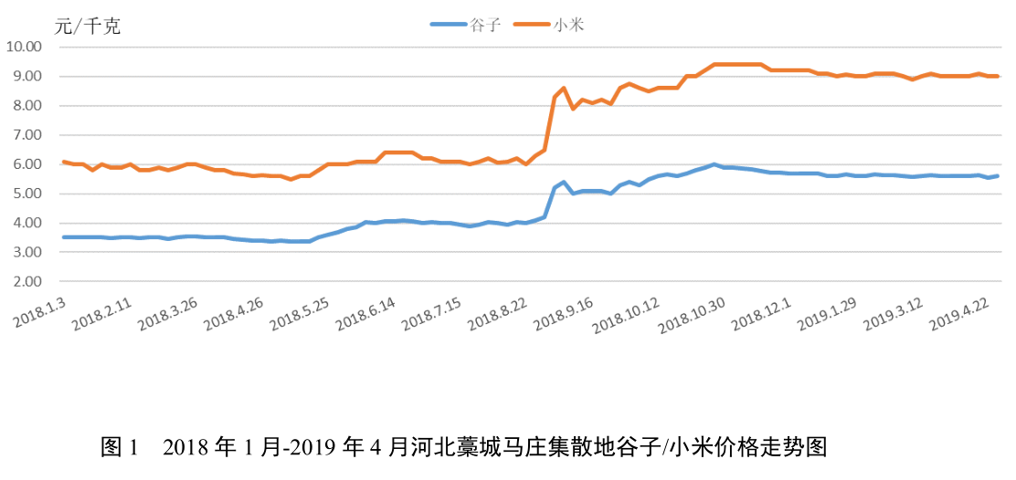 1-4 月份石家庄某大型批发市场的小米价格维持在 7.70 元/千克,北京新发地批发市场的小米价格维持在 9.50 元/千克的高位,小米面价格维持在 10.00 元/千克,2019 年 1-4 月批发市场小米价格没有变化。