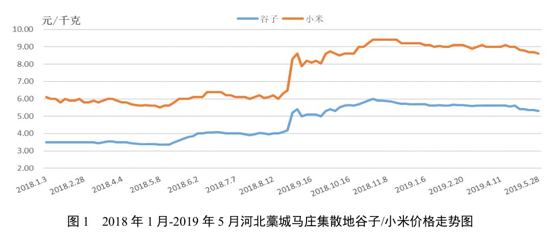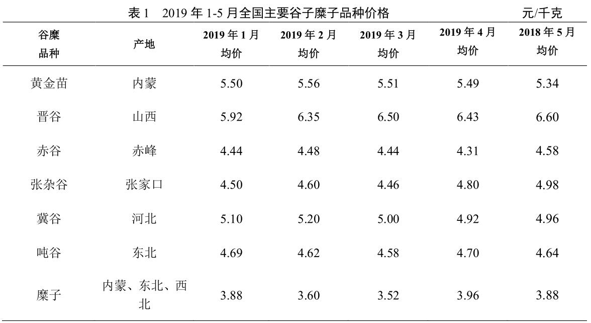 1-5 月份石家庄某大型批发市场的小米价格维持在 7.70 元/千克,北京新发地批发市场的小米价格维持在 9.50 元/千克的高位,小米面价格维持在 10.00 元/千克,2019 年 1-5 月批发市场小米价格没有变化。