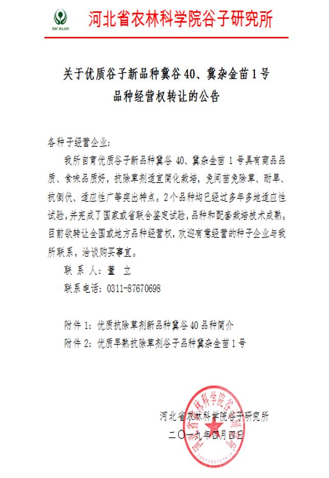 关于优质谷子新品种冀谷40、冀杂金苗1号品种经营权转让的公告