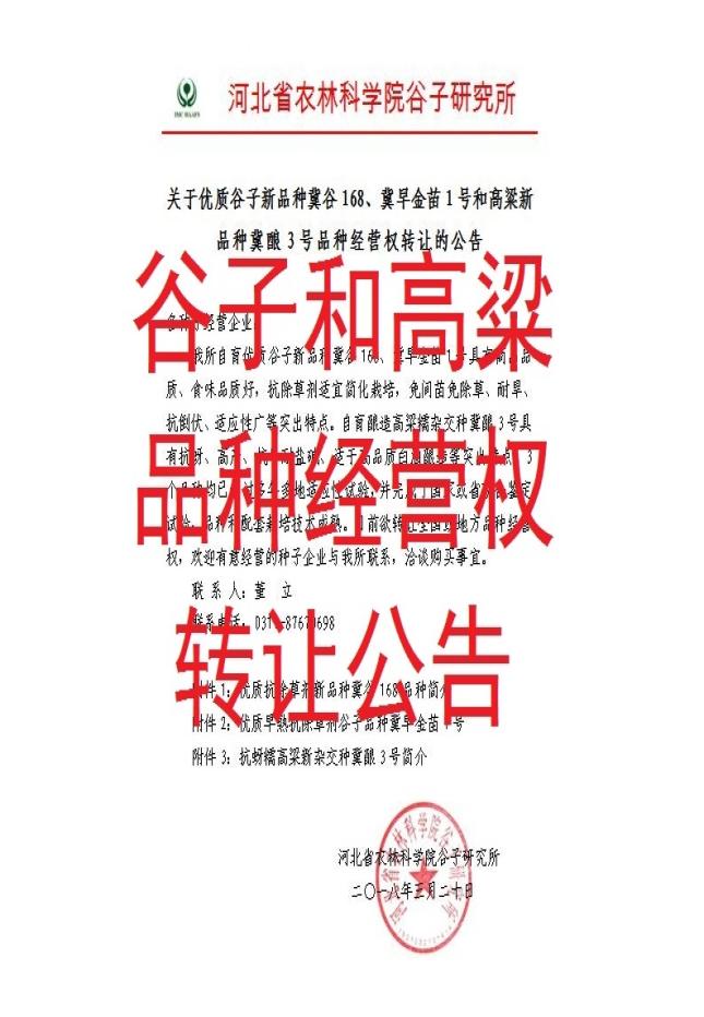 关于优质谷子新品种冀谷168、冀早金苗1号和高粱新品种冀酿3号品种经营权转让的公告
