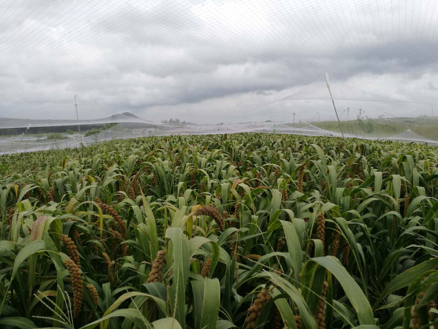 谷苗上方有一层防鸟网。除了给鸟留出觅食的谷子地块,其余地块全网覆盖。受访者供图