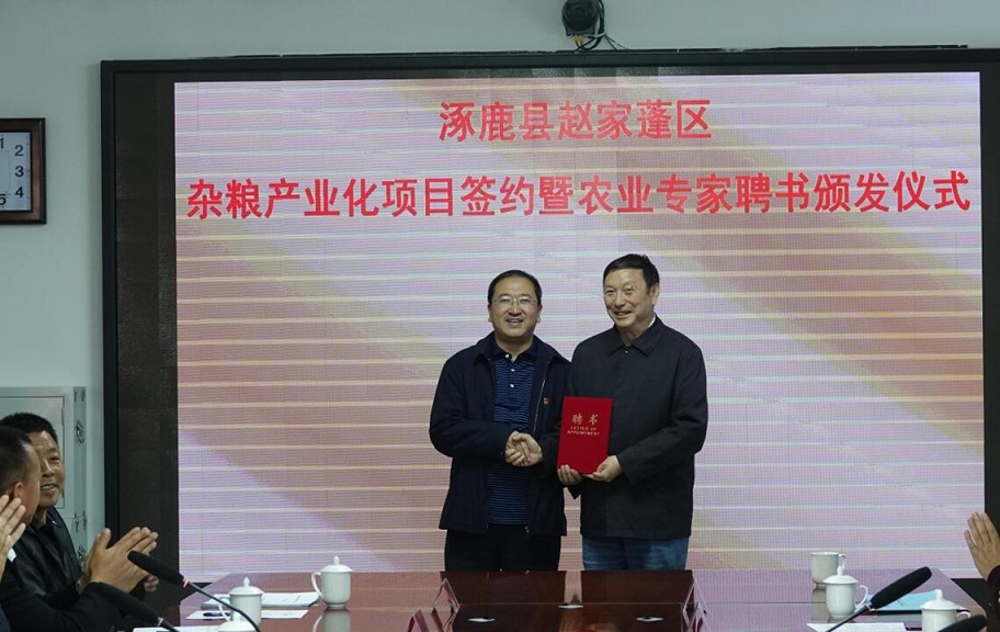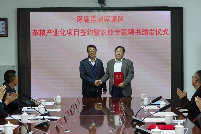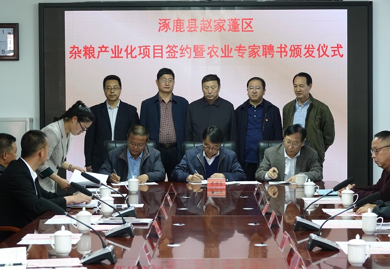 2019年5月9日上午,“涿鹿县赵家蓬区杂粮产业化项目签约和河北省杂粮研究实验室试验示范培训基地挂牌仪式”在涿鹿县赵家蓬区举行。涿鹿县赵家蓬区公所、河北省农林科学院谷子研究所、涿鹿天行健生态农业开发有限责任公司主要领导和杂粮专家团队成员20余人参加了签约仪式。