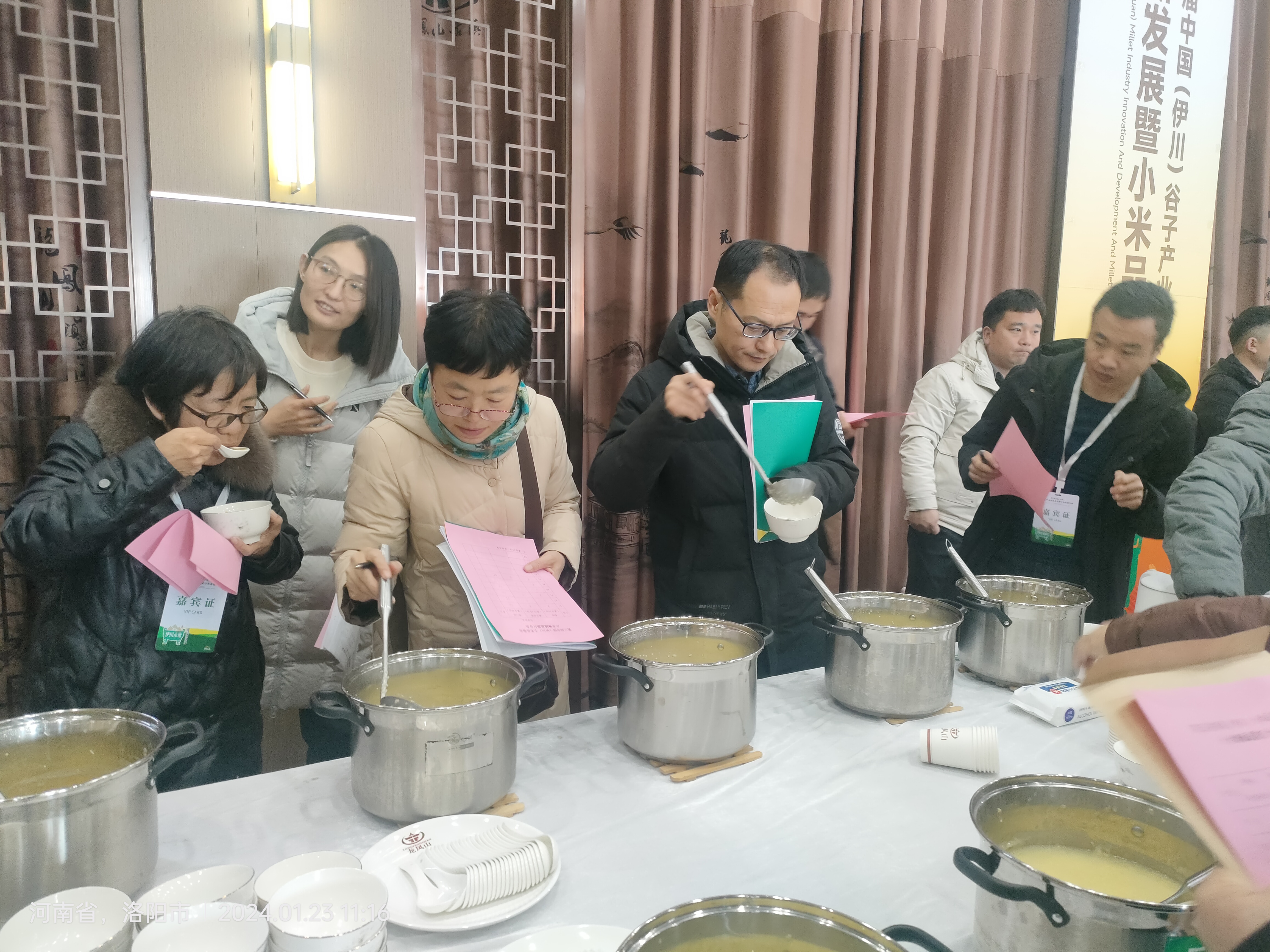 中国作物学会粟类作物专业委员会、国家谷子高粱产业技术体系的组织下,全国27家谷子育种科研单位和种子公司提供了63个新品种(系),所有品种在伊川县河南省谷子产业园统一种植和管理,生长季进行谷子新品种展示,成熟收获后在统一加工程序下进行品质鉴定比较。鉴评委员会由我国权威育种专家、著名小米加工企业家、小米经销商和种植户代表60人组成。从小米颜色、均匀度、颗粒大小等商品属性和米粥色泽、粘稠度、香味、口感等食味属性进行品鉴。