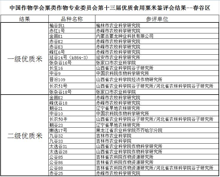 全国各地科研单位参评的谷子品种共计60个,其中春谷区品种37个,夏谷区品种23个。按照鉴评规则,参选品种分春谷夏谷两组进行鉴评。参评品种编号采取二次重编号原则,由2位专家独立再次编号。由全国各研究单位的粟类作物专业委员会主任委员和副主任委员等组成鉴评专家组,对参评品种从小米的商品品质和食味品质进行了鉴评和打分。通过专家组现场打分和统计最后本届鉴评会共评选出一级优质米21个,其中夏谷8个,春谷13个;二级优质米25个,其中夏谷10个,春谷15个。