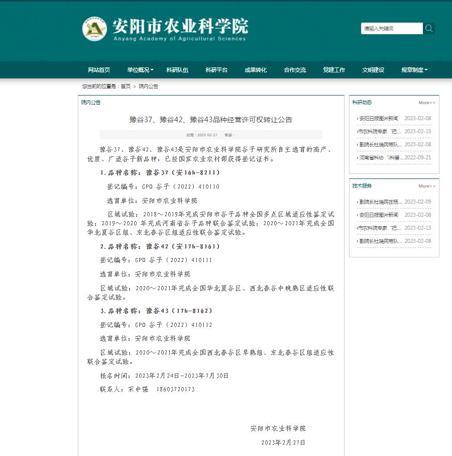 豫谷37、豫谷42、豫谷43是安阳市农业科学院谷子研究所自主选育的高产、优质、广适谷子新品种,已经国家农业农村部获得登记证书。